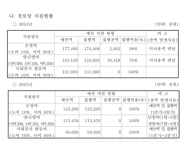이에 김 위원장은 “지난해 윤석열 정부에서 (냉난방비 잔액 반납에 대한) 불편함이 있다고 생각을 해서 시정조치를 했고 중장년노인과를 통해서 진행하도록 건의를 드렸다”라며 “그럼에도 24%, 거의 4,000여만 원이 집행 잔액으로 발생하는 부분에 대해서는 적극적인 행정을 못 하신 것 같다”라고 강하게 질타했다.