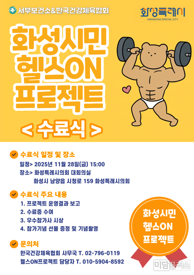 화성시서부보건소(소장 곽매헌)와 한국건강체육협회(회장 윤영민)가 함께 추진한 ‘화성시민 헬스ON 프로젝트’가 2025년 11월 21일부로 성공적으로 프로젝트를 종료했다. 이에 따라 오는 11월 28일(금) 오후 3시, 화성특례시의회 대회의실에서 수료식(종강식)을 개최한다.