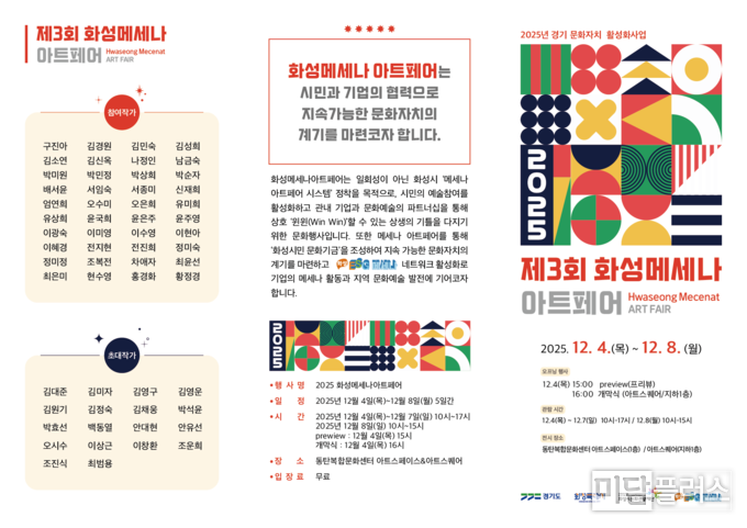 올해로 3회째를 맞이하는 메세나 아트페어가 화성특례시에서 성대하게 개최된다. 이번 아트페어는 문화자치의 일환으로, 작품 판매액의 40%를 기부 적립하여 젊은 작가와 실험적이고 창의력 있는 작가들을 지원하는 데 목적을 두고 있다.
