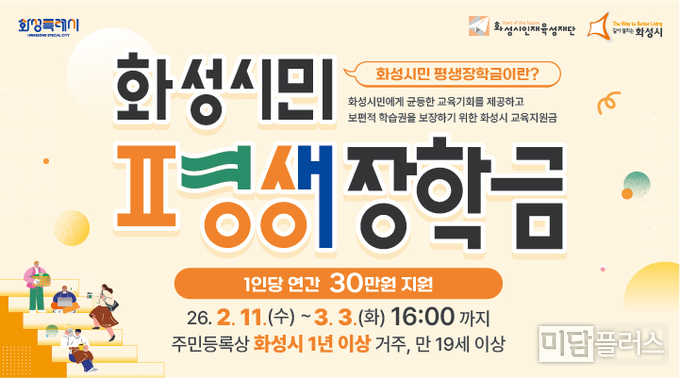 (재)화성시인재육성재단(대표이사 임선일)에서 2026년도 화성시민 평생장학금 이용자를 2월 11일부터 3월 3일까지 21일간 온라인으로 모집한다.