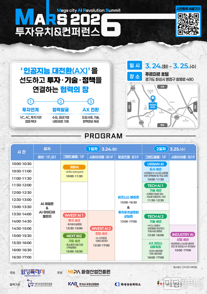 화성특례시(시장 정명근)가 오는 3월 24일부터 25일까지 이틀간 푸르미르 호텔에서 「MARS 2026 투자유치 & 컨퍼런스」를 개최한다.