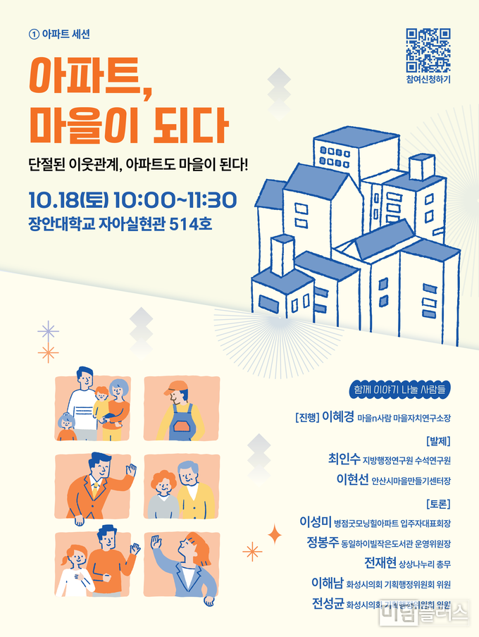 ① 아파트, 마을이 되다 (10.18. 10:00): 단절된 아파트 이웃 관계를 마을로 만들어가는 방안을 모색한다.