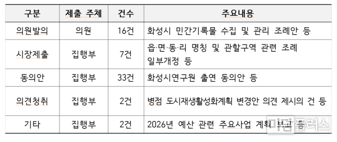이번 임시회에서는 의원 발의 안건으로『화성시 민간기록물 수집 및 관리에 관한 조례안』등 조례안 16건이 발의되었으며, 화성시장으로부터『화성시 읍·면·동·리의 명칭 및 관할구역에 관한 조례 일부개정조례안』등 조례안 7건, 『화성시연구원 출연 동의안』등 동의안 33건, 『병점 도시재생활성화계획 변경안에 대한 의견 제시의 건』등 의견청취의 건 2건, 『2026년 예산관련 주요사업 계획보고』 등 기타 안건 2건, 총 60건이 제출되어 각 소관 상임 위원회에 회부됐다.