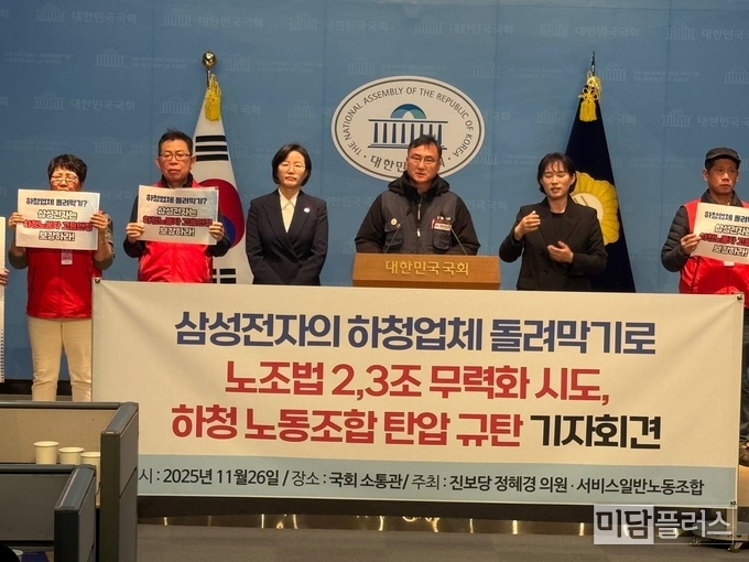 이와 관련하여, 삼성전자의 하청업체 돌려막기와 노조법 2, 3조 무력화 시도, 하청 노동조합 탄압을 규탄하는 기자회견이 열렸다. 이 기자회견은 진보당 정혜경 국회의원과 민주노총 서비스일반노동조합이 주최하였으며, 2025년 11월 26일 오후 2시에 국회의사당 소통관에서 진행됐다.