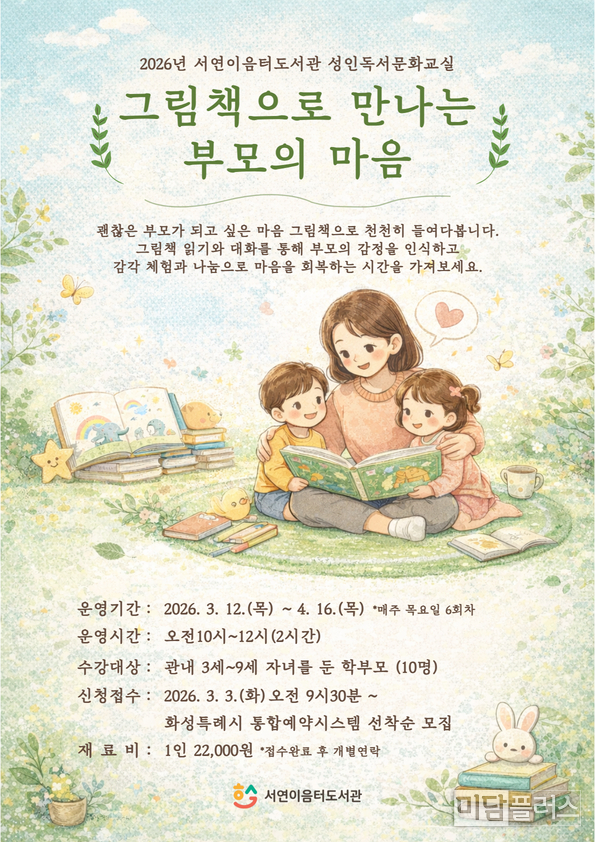 화성시인재육성재단(대표이사 임선일) 서연이음터도서관은 오는 3월 12일(목)부터 4월 16일(목)까지 매주 목요일, 총 6회에 걸쳐 3세~9세 자녀를 둔 학부모를 대상으로 성인 독서문화교실 「그림책으로 만나는 부모의 마음」 프로그램을 운영한다고 밝혔다.