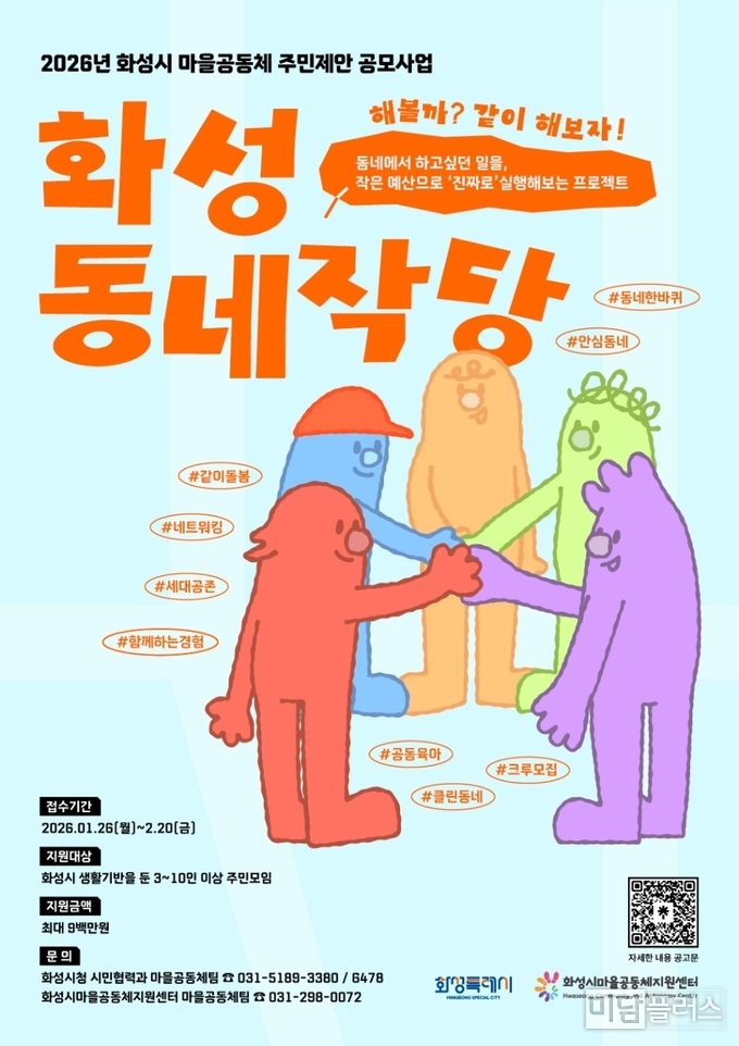 화성특례시(시장 정명근)가 주민 주도의 마을문제 해결과 공동체 활성화를 위한 ‘2026년 마을공동체 주민제안 공모사업’ 참여자를 1월 26일부터 2월 20일까지 모집한다고 1월 23일 밝혔다.