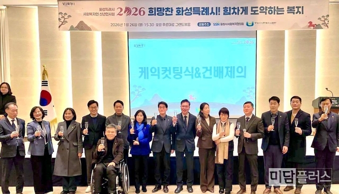 화성특례시의회(의장 배정수)는 1월 26일 호텔 푸르미르 그랜드볼룸에서 열린 「2026년 화성시사회복지협의회·사회복지사협회 신년인사회」에 참석해, 병오년 새해를 맞아 사회복지 종사자들과 함께 희망과 연대의 뜻을 나눴다.