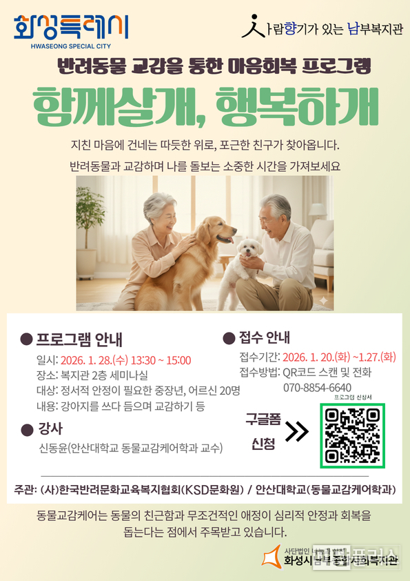 사단법인 한국반려문화교육복지협회(KSD문화교육원)와 화성시남부종합사회복지관은 1월 28일, 취약계층 어르신을 대상으로 반려동물 교감을 통한 정서 회복 프로그램 「함께살개, 행복하개」를 운영했다.