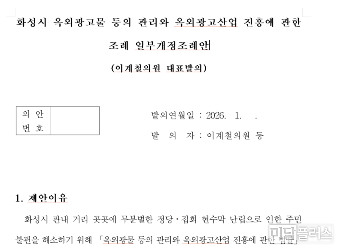 이번 조례는 화성특례시의회 이계철 의원 (도시건설위원장)이 대표 발의한 조례로, 제 248회 임시회에서 2월 13일 가결됐다. 시는 이번 조례 개정을 통해 그동안 관리 사각지대에 놓여 주민 불편을 초래했던 정당ㆍ집회현수막의 표시 및 설치 기준을 구체화하고, 이를 위반할 경우 행정 처분을 내릴 수 있는 근거를 마련했다.