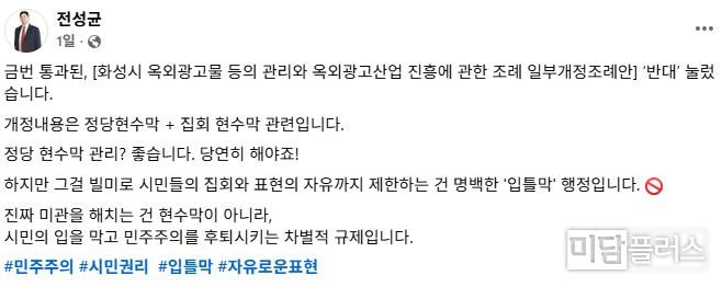 이에 관해 전성균 화성특례시의원은 소셜 미디어를 통해, "본 조례에 대해 의회에서 반대 의견을 표시했다. 정당 현수막 관리를 빌미로 시민의 표현의 자유를 제한 하는 것은 명백한 '입틀막' 행정이다. 진짜 미관을 해치는 것은 시민의 입을 막고 민주주의를 후퇴시키는 차별적 규제다" 라고 일갈했다.
