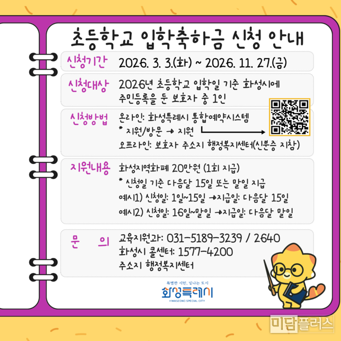 화성특례시(시장 정명근)는 2026학년도 초등학교 1학년 입학생을 대상으로 ‘초등학교 입학축하금 지원사업’을 시행한다. 이번 사업은 초등학교 입학생 자녀를 둔 가정의 경제적 부담을 덜고, 보편적 교육복지를 실현하기 위해 마련됐다.