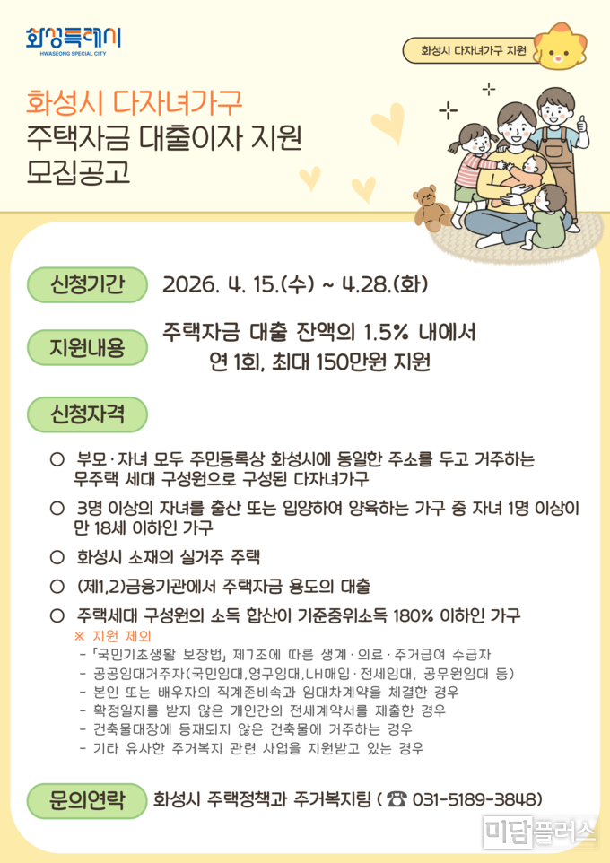 화성특례시(시장 정명근)가 무주택 신혼부부와 다자녀 가구의 주거부담을 완화하고 안정적인 정착을 돕기 위해 2026년 주택(전세)자금 대출이자 지원사업 대상자를 모집한다. 이번 사업은 출산과 육아로 인한 경제적 부담을 덜고 젊은 세대가 안심하고 아이를 키울 수 있는 주거 환경을 조성하고자 마련됐다.