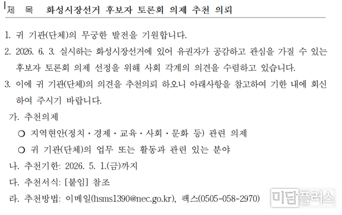 최근 화성시 선관위는 본지를 포함한 지역 언론사에 ‘후보자 토론회 의제 및 질문사항 추천 요청’ 메일을 발송했다. 이번 요청은 유권자들이 실질적으로 공감하고 관심을 가질 수 있는 토론회 의제를 발굴하여, 후보자 검증의 효율성을 높이기 위한 취지다.