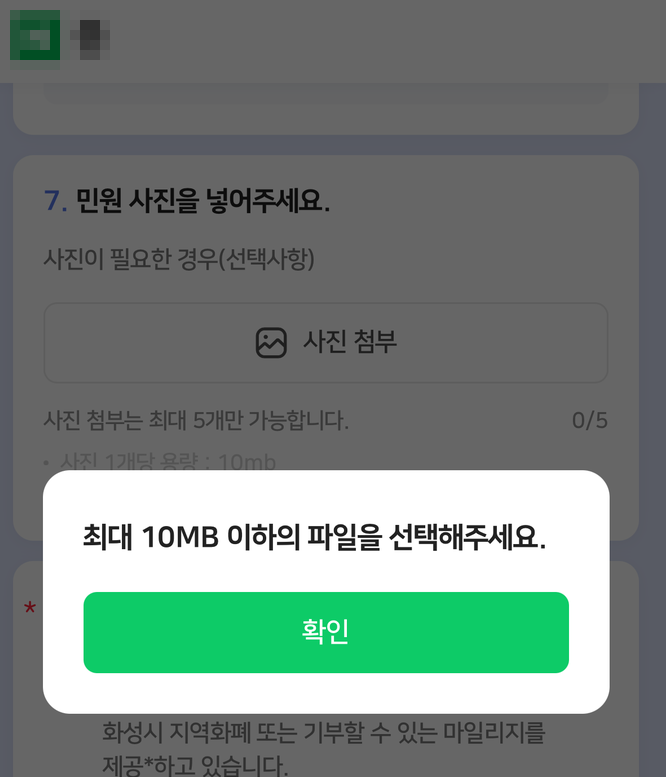 둘째, 사진 용량 '10MB' 는 턱없이 부족하다. 민원의 핵심은 증거 사진이다. 그러나 현재 시스템은 민간 외부 포털과 연동되어 있어 업로드 용량이 최대 10MB로 제한된다. 고화질 스마트폰 촬영이 일상화된 시대에 10MB 이하로 사진 용량을 줄여 올리라는 것은, 기기 조작이 서툰 어르신이나 바쁜 현대인들에게 사실상 '사진 포기'를 종용하는 것과 다름없다. 이 부분을 개선해야 민원 담당 공무원도 일 처리가 훨씬 쉬울 것이다.