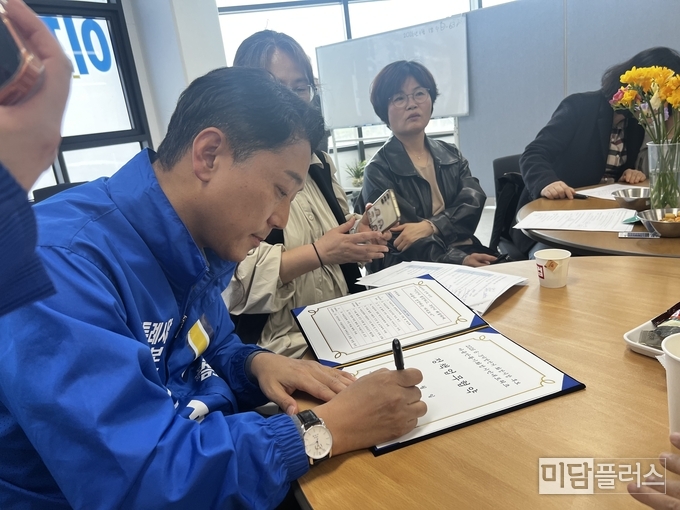 이어 진행된 정책 협약 과정에서 진 예비후보는 마을넷 측이 제안한 정책협약서 내용을 위원과 함께 꼼꼼히 검토했다. 그는 단순히 서명만 하는 요식 행위에 그치지 않고, 각 항목에 대해 '당장 실행 가능한 단기 과제'와 '조례 개정 등이 필요한 장기 과제'를 예리하게 구분하는 실무 전문가다운 면모를 보였다. 검토를 마친 진 예비후보는 정책협약서에 직접 서명하며 제안된 정책들을 자신의 공약에 적극 반영할 것을 약속했다.