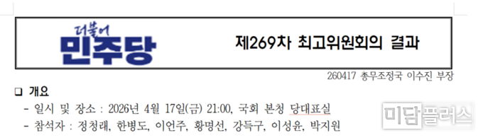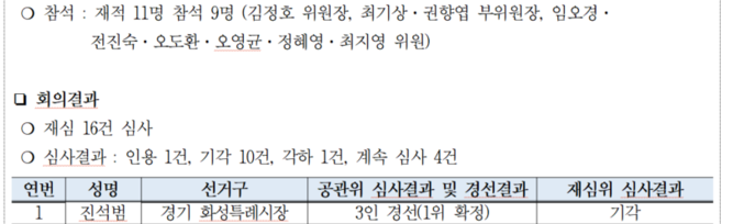 민주당은 4월 17일 저녁 9시경 제269차 최고위원회를 열고, 중앙당 재심위원회로부터 ‘계속 심사’ 안건으로 회부되었던 화성시장 경선 관련 재심 신청에 대해 심의한 결과 ‘기각’으로 최종 의결했다.