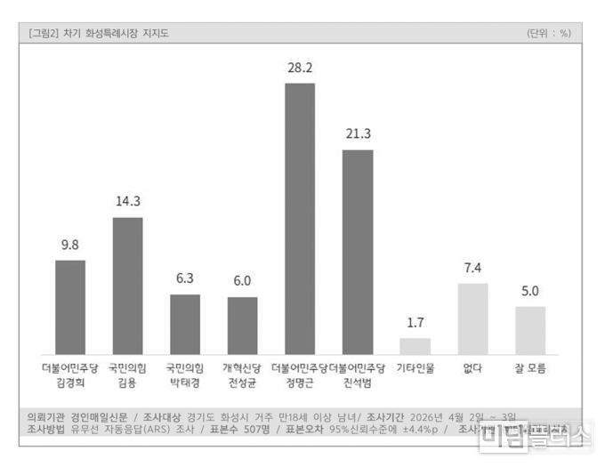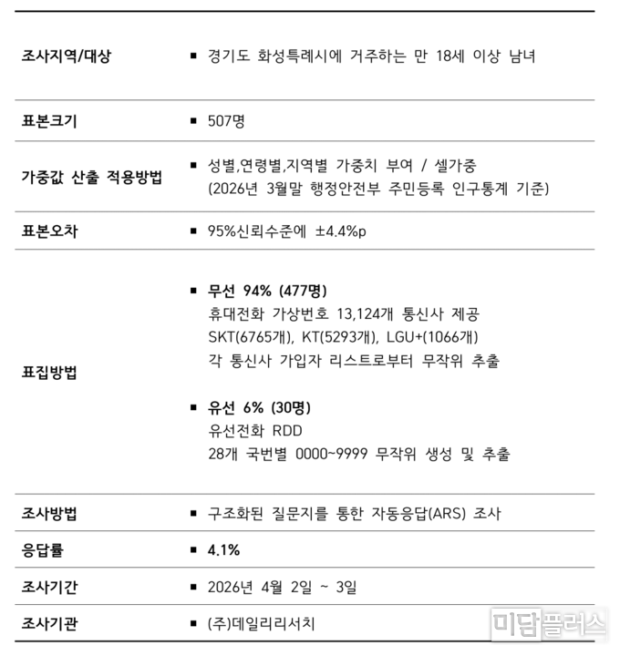 이번 조사는 경인매일신문 의뢰로 데일리리서치가 4월 2일부터 3일까지 이틀간 화성특례시 거주 만 18세 이상 성인남녀 507명을 대상으로 유무선 ARS 방식으로 실시됐다. 표본오차는 95% 신뢰수준에서 ±4.4%p이며 응답률은 4.1%다. 휴대전화 가상번호(94%)와 유선 RDD(6%)를 병행해 표본을 추출했고 성·연령·지역별 가중치를 부여했다. 자세한 내용은 중앙선거여론조사심의위원회 홈페이지에서 확인할 수 있다.