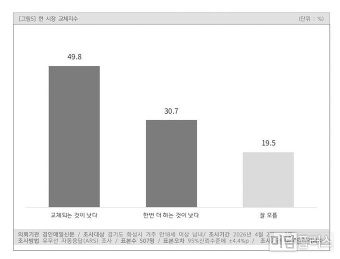 현 시장에 대한 교체 여론은 49.8%로, ‘유지’ 응답(30.7%)을 크게 앞섰다.
