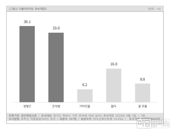 더불어민주당 후보 적합도 조사에서는 진석범 후보가 33.0%로 정명근 시장(36.1%)과의 격차를 3.1%p까지 좁혔다. 해당 결과는 오차범위(±4.4%p) 내로, 사실상 초접전 양상으로 해석된다.