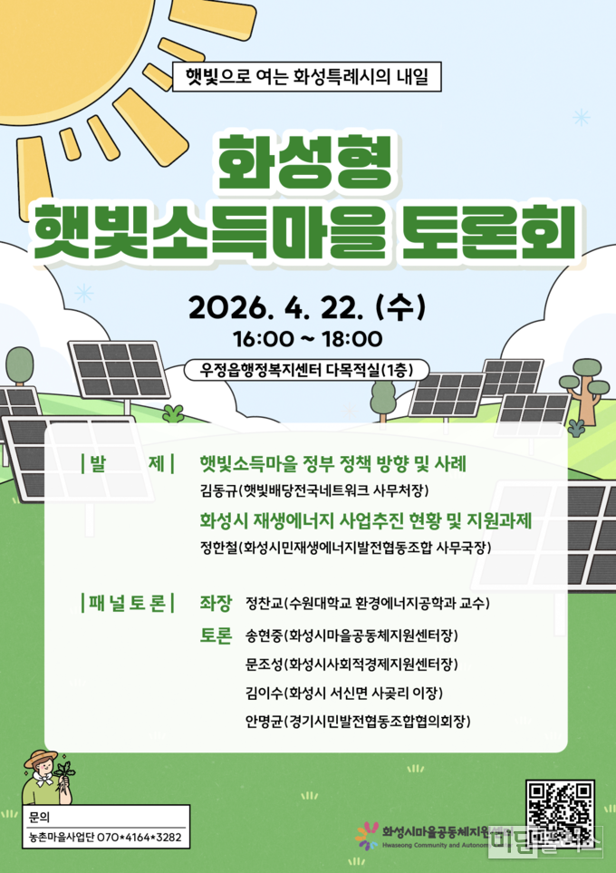 이어지는 패널토론에서는 정찬교 수원대학교 환경에너지공학과 교수가 좌장을 맡아 화성형 햇빛소득마을의 추진 방향을 모색한다. 토론에는 송현중 화성시마을공동체지원센터장, 문조성 화성시사회적경제지원센터장, 김이수 화성시 서신면 사곶리 이장, 안명균 경기시민발전협동조합협의회장이 참여해 정책과 현장을 잇는 다양한 의견을 나눌 계획이다.